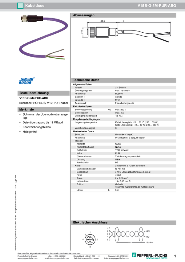 219111 Pepperl+Fuchs 219111 Gniazdo kablowe V15B-G-5M-PUR-ABG, piny: 2, 5.00 m, 1...
