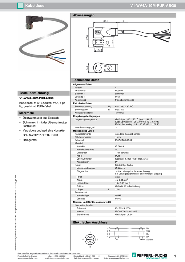 214222 Pepperl+Fuchs 214222 Gniazdo kablowe V1-WV4A-10M-PUR-ABG0, piny: 4, 10.00 m...