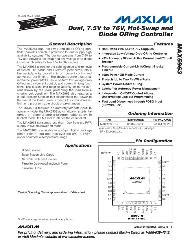 MAX5963 Dual, 7.5V to 76V, Hot-Swap and Diode ORing Controller