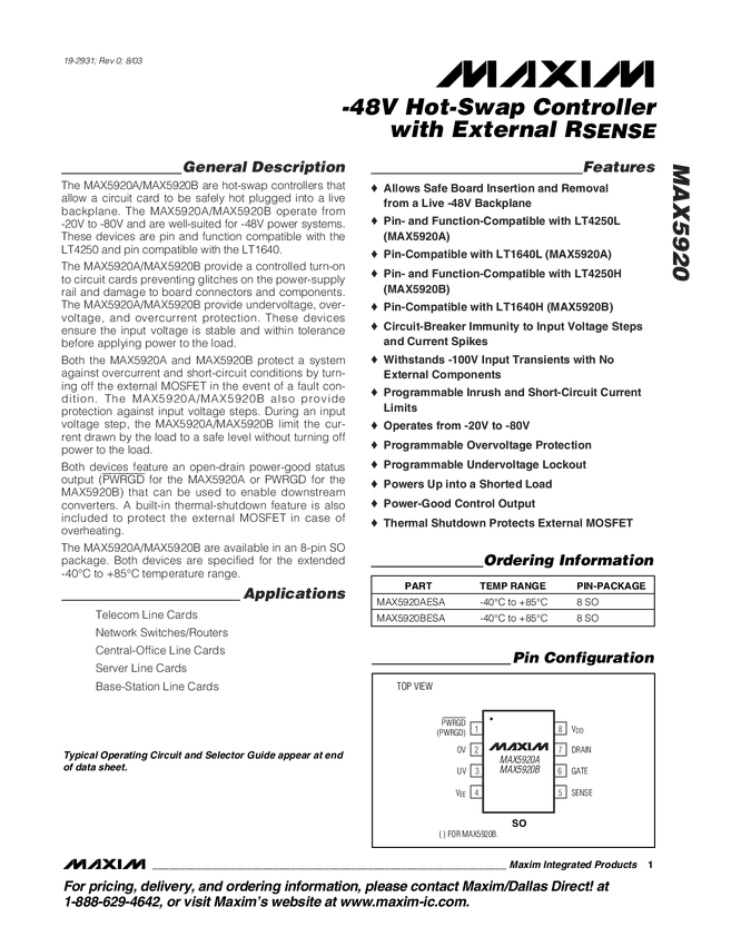 MAX5920 -48V Hot-Swap Controller with External R