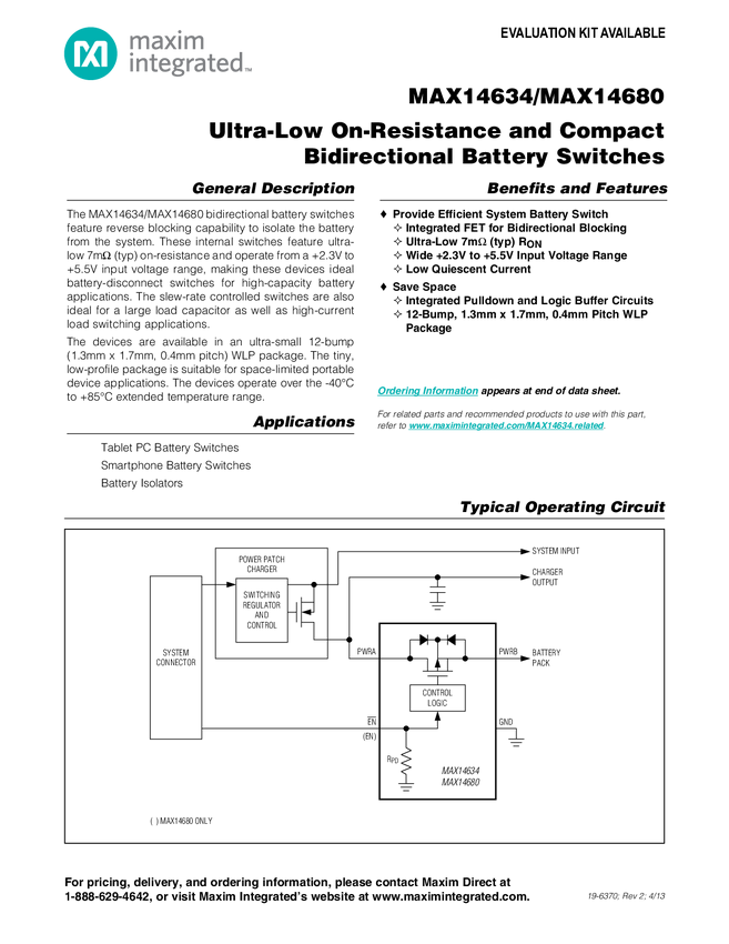 MAX14634 Ultra-Low On-Resistance and Compact Bidirectional Battery Switches