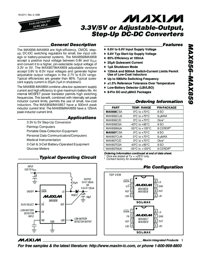 MAX858 3.3V/5V or Adjustable Output, Step-Up DC-DC Converters