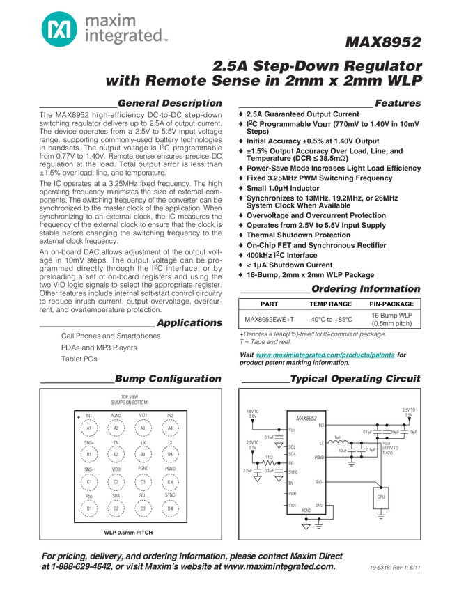 MAX8952 2.5A Step-Down Regulator with Remote Sense in 2mm x 2mm WLP