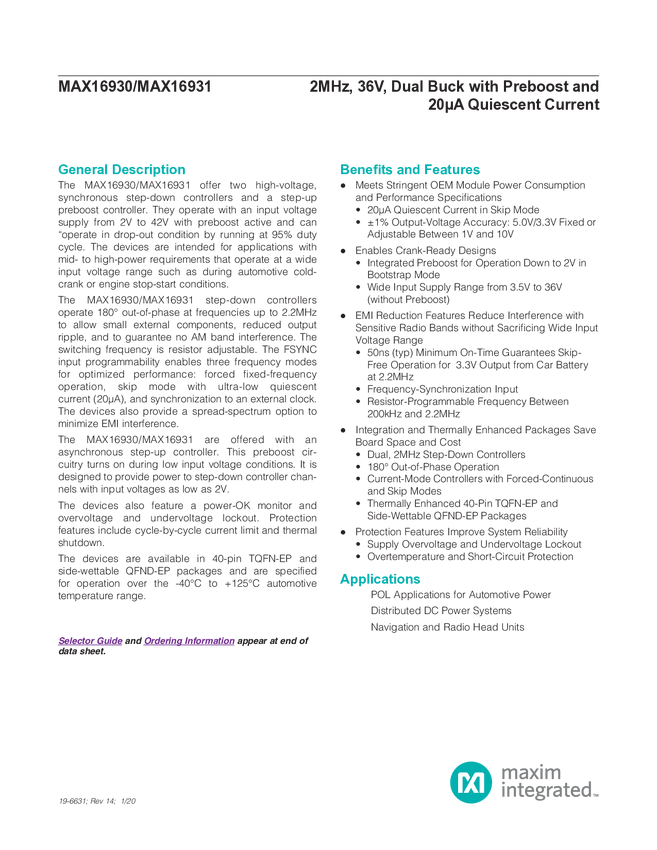 MAX16930 2MHz, 36V, Dual Buck with Preboost and 20µA Quiescent Current