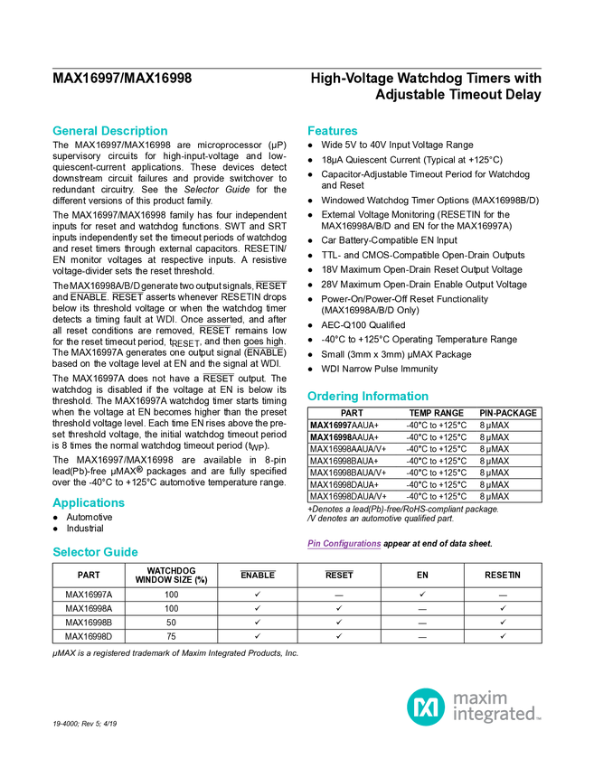 MAX16997 High-Voltage Watchdog Timers with Adjustable Timeout Delay