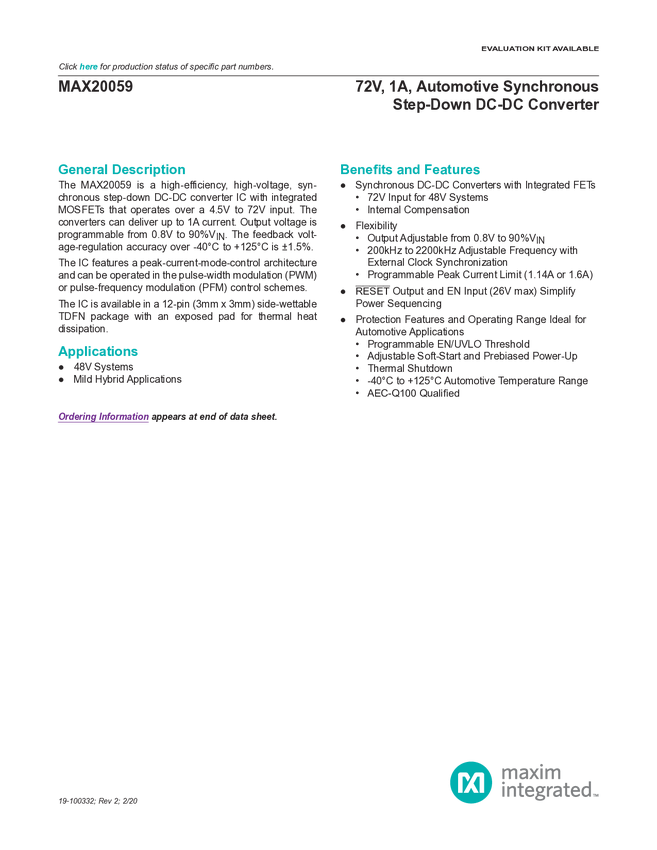 MAX20059 72V, 1A, Automotive Synchronous Step-Down DC-DC Converter