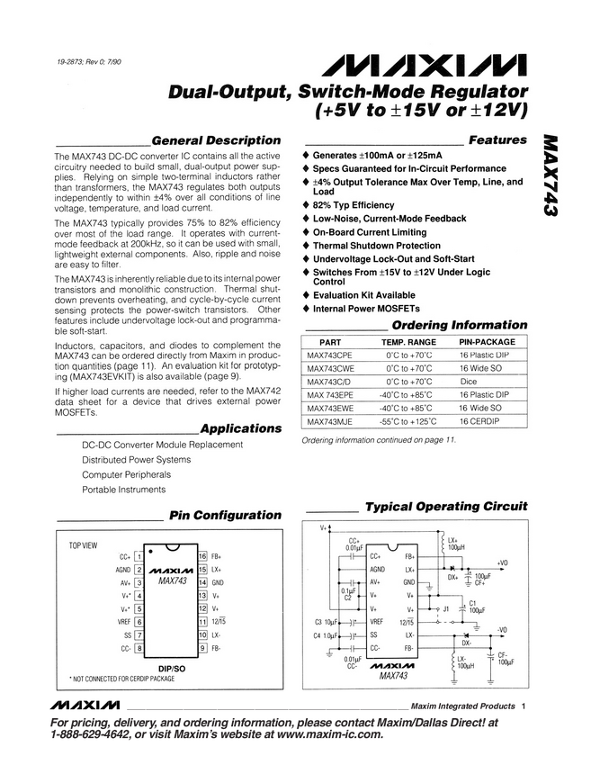MAX743 Dual-Output, PWM Switch-Mode Regulator (5V to ±15V or ±12V)