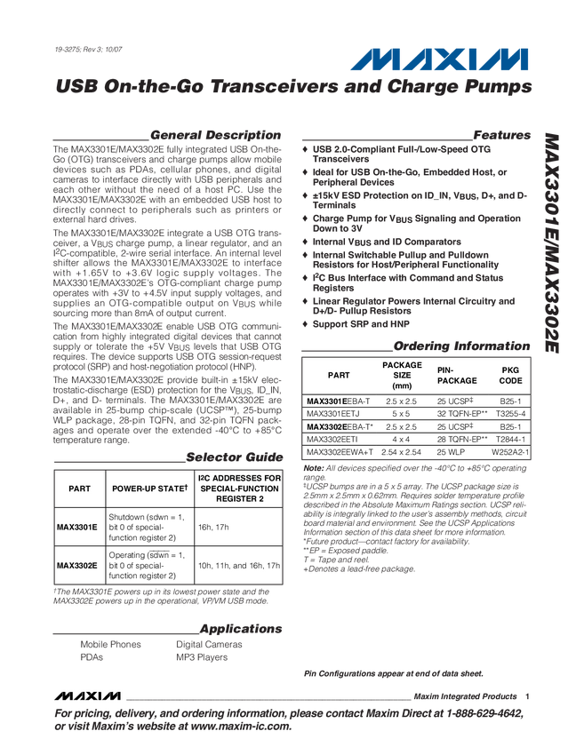 MAX3301E USB On-the-Go Transceivers and Charge Pumps
