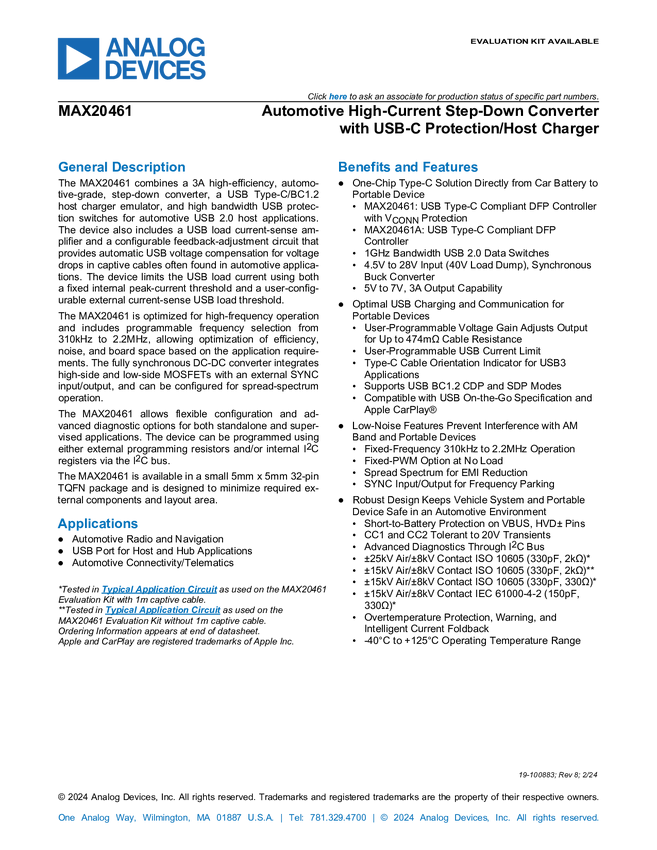 MAX20461A Automotive High-Current Step-Down Converter with USB-C Protection/Host Char...