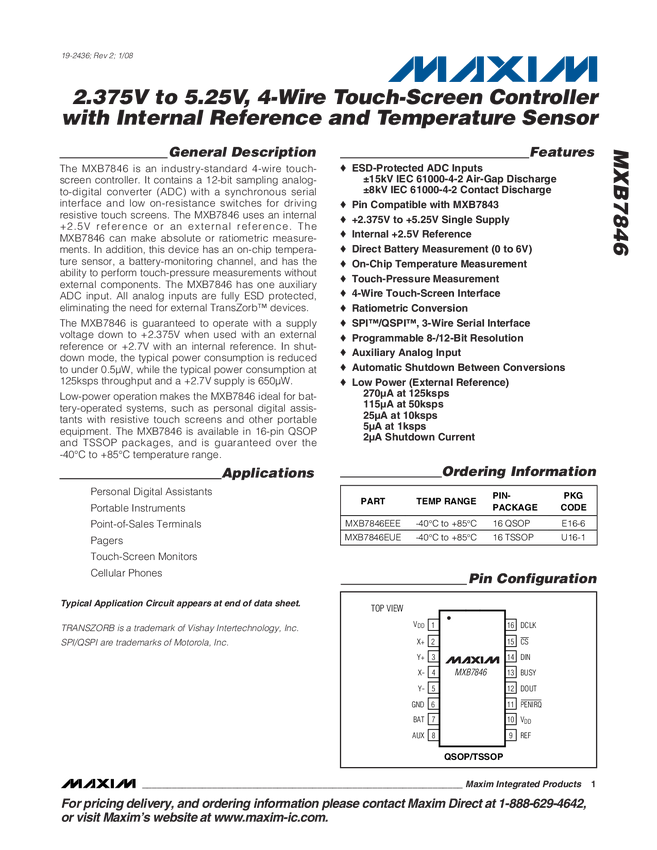 MXB7846 2.375V to 5.25V, 4-Wire Touch-Screen Controller with Internal Reference and...