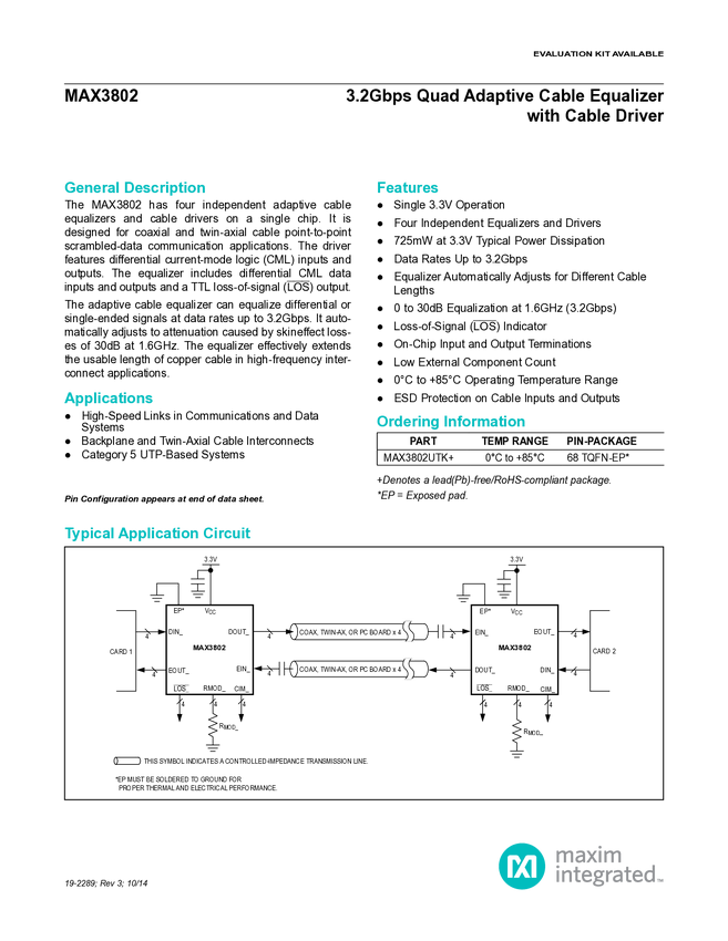 MAX3802 3.2Gbps Quad Adaptive Cable Equalizer with Cable Driver