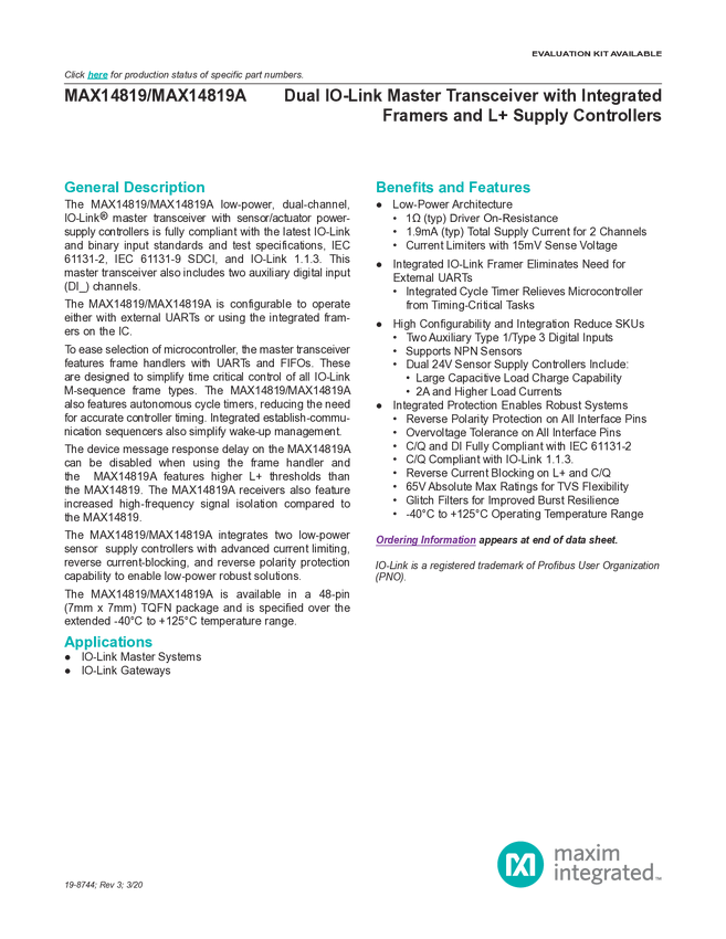 MAX14819A Dual IO-Link Master Transceiver with Integrated Framers and L+ Supply Contr...