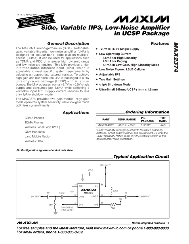 MAX2374 SiGe, Variable IIP3, Low-Noise Amplifier in UCSP Package