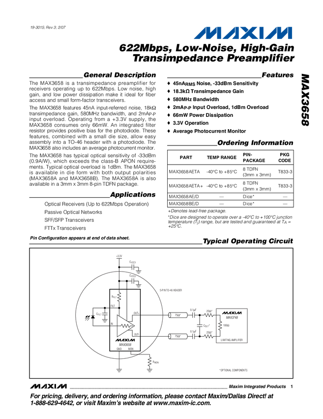 MAX3658 622Mbps, Low-Noise, High-Gain Transimpedance Preamplifier