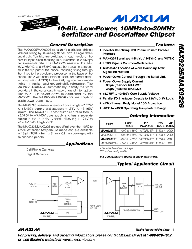 MAX9225 10-Bit, Low-Power, 10MHz-to-20MHz Serializer and Deserializer Chipset