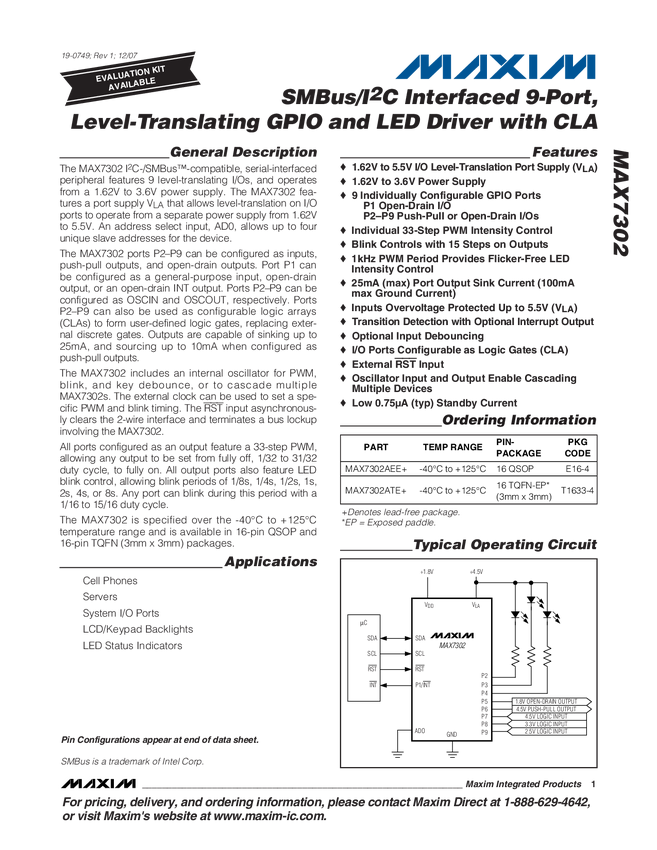 MAX7302 SMBus/I²C Interfaced 9-Port, Level-Translating GPIO and LED Driver with CLA