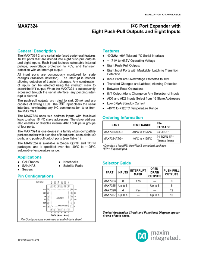 MAX7324 I²C Port Expander with Eight Push-Pull Outputs and Eight Inputs