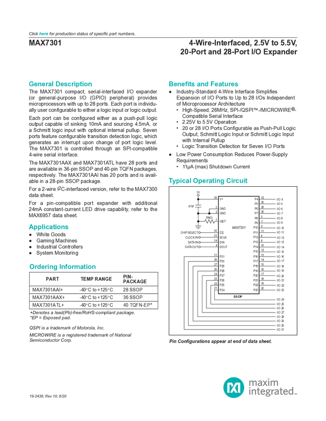 MAX7301 4-Wire-Interfaced, 2.5V to 5.5V, 20-Port and 28-Port I/O Expander