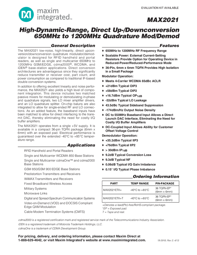 MAX2021 High-Dynamic-Range, Direct Up-/Downconversion 650MHz to 1200MHz Quadrature...