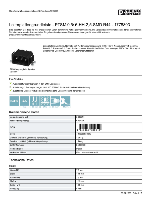 Phoenix Contact 1778803 Obudowa złącza pin męskiego na PCB PTSM 0,5/ 6-HH-2,5-SMD R44, piny: 6, 6 A, 600 szt.