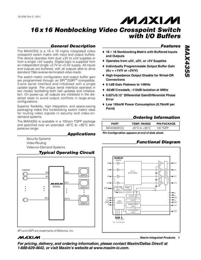 MAX4355 16x16 Nonblocking Video Crosspoint Switch with I/O Buffers