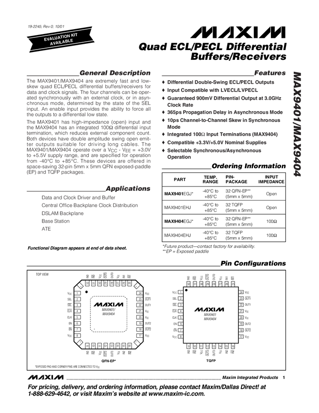 MAX9401 Quad ECL/PECL Differential Buffers/Receivers