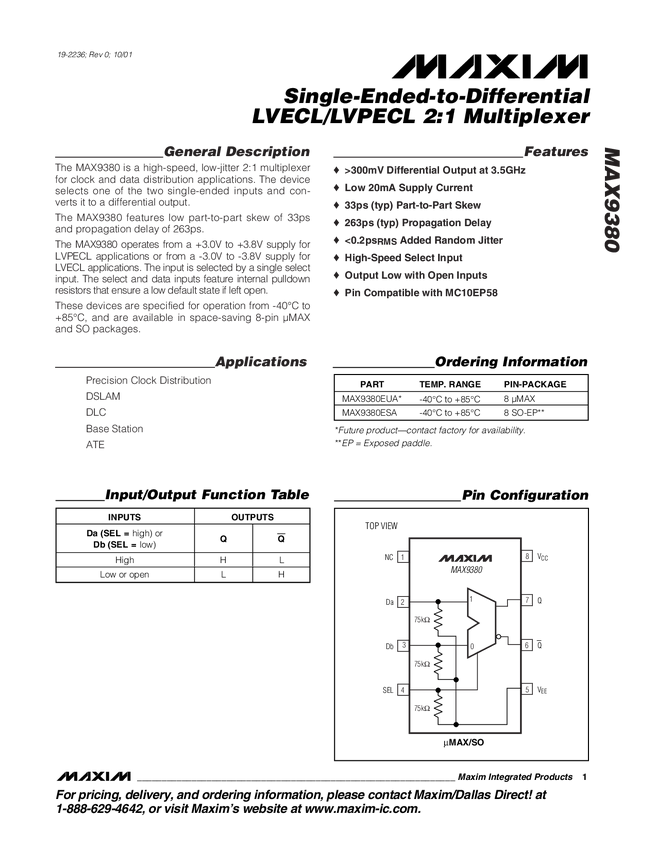 MAX9380 Single-Ended-to-Differential LVECL/LVPECL 2:1 Multiplexer