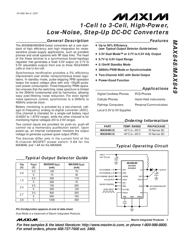 MAX849 1-Cell-to-3-Cell, High-Power, Low-Noise, Step-Up DC-DC Converters
