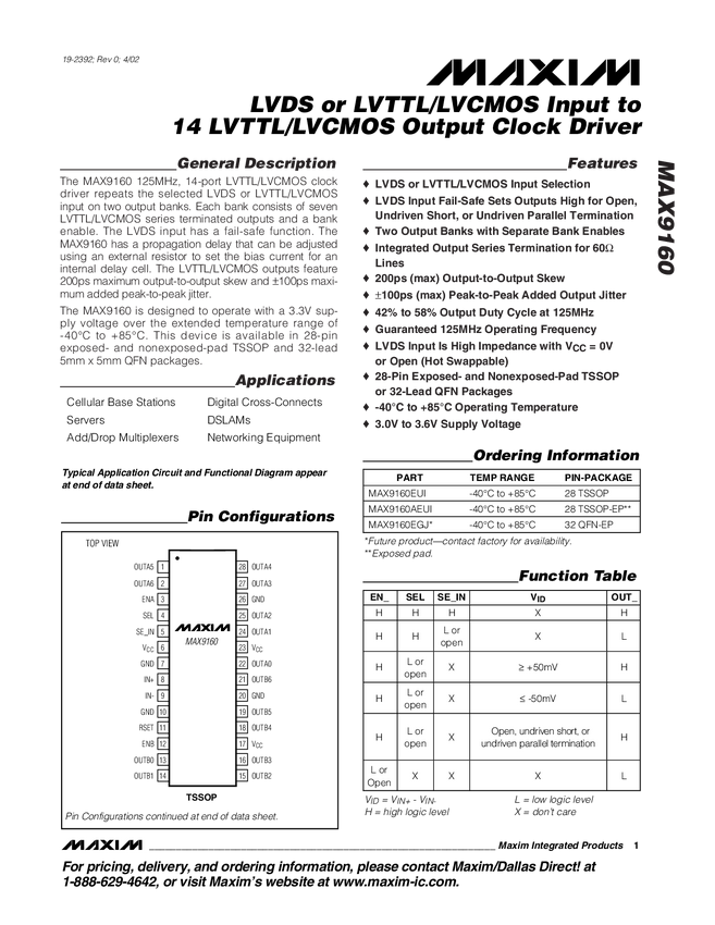 MAX9160 LVDS or LVTTL/LVCMOS Input to 14 LVTTL/LVCMOS Output Clock Driver