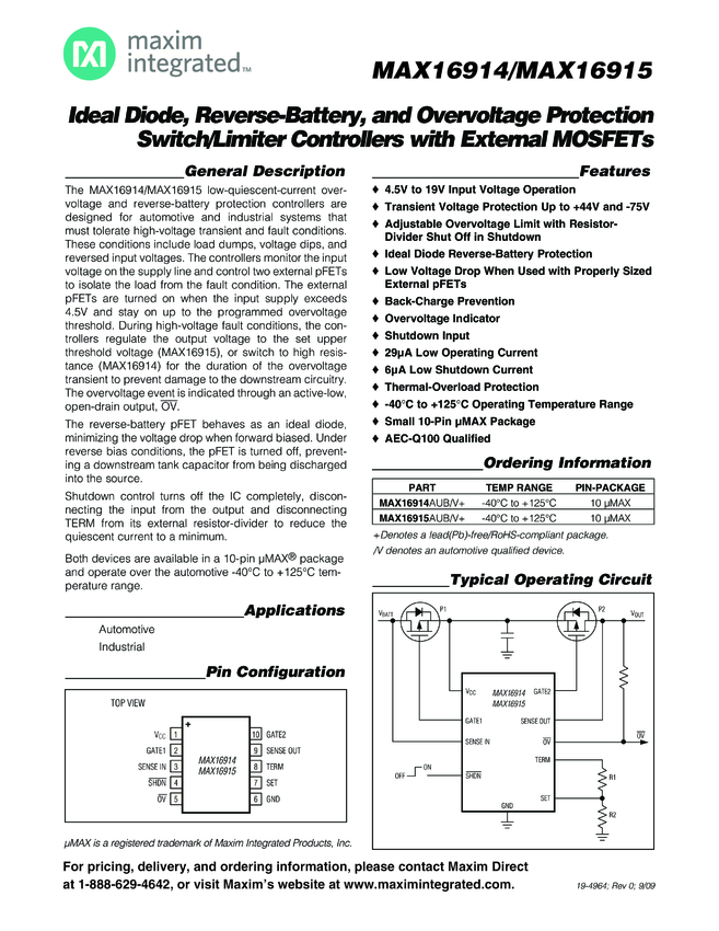 MAX16914 MAX16914, MAX16915 Ideal Diode, Reverse-Battery, and Overvoltage Protection...