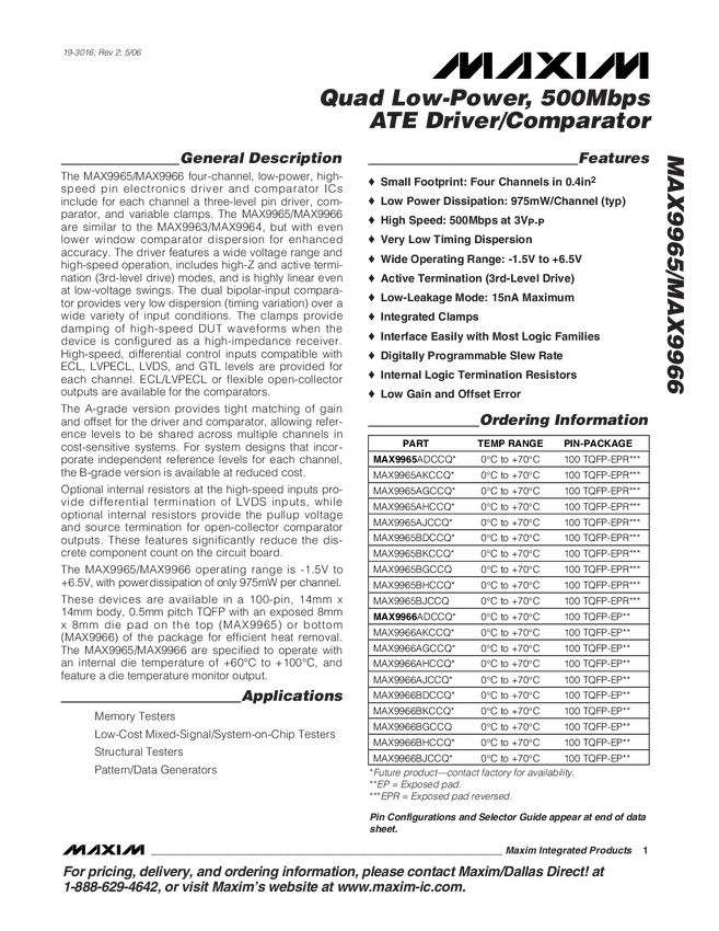 MAX9965 Quad, Low-Power, 500Mbps ATE Driver/Comparator