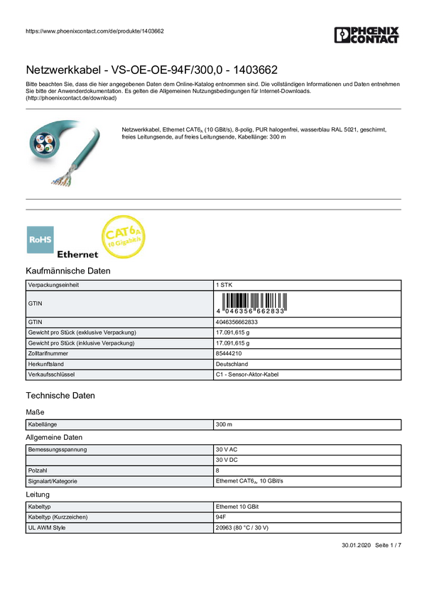 1403662 Phoenix Contact 1403662 Przewód sieciowy PUR halogenfrei 4 x 2 x 0.14 mm² n...