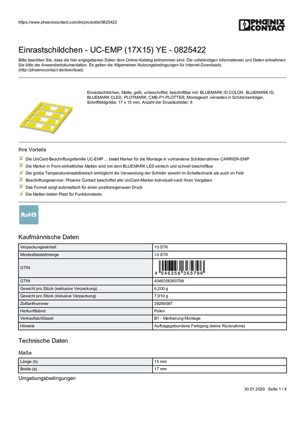 Tabliczka do etykietowania Phoenix Contact UC-EMP (17X15) YE 0825422, montaż: blokada, etykiety na arkuszu: 8, 10 szt.
