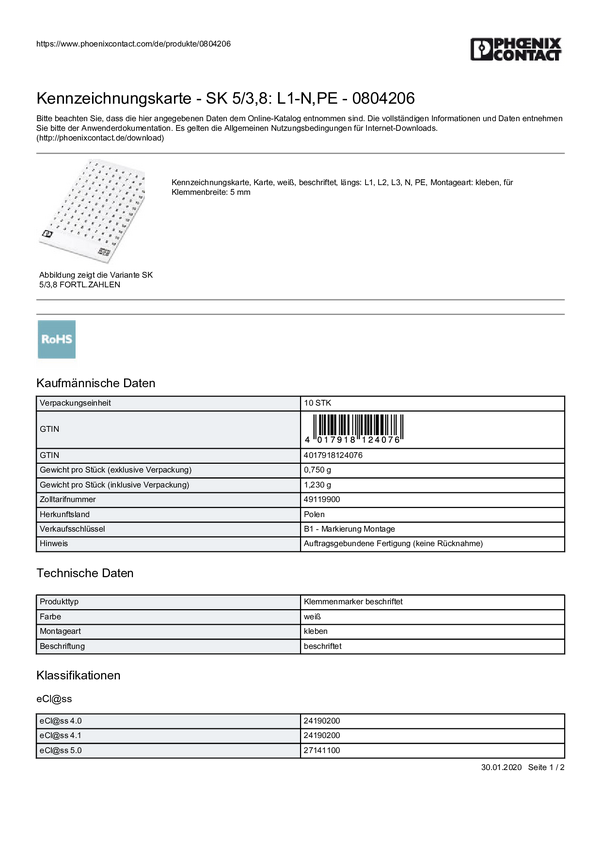 Karta identyfikacyjna Phoenix Contact SK 5/3,8: L1-N,PE 0804206, 10 szt.
