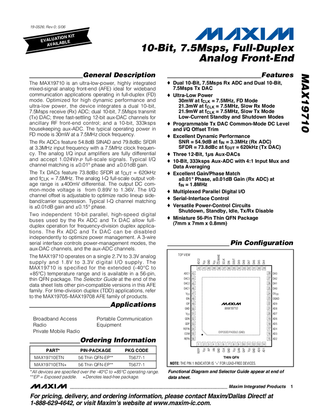 MAX19710 10-Bit, 7.5Msps, Full-Duplex, Analog Front-End