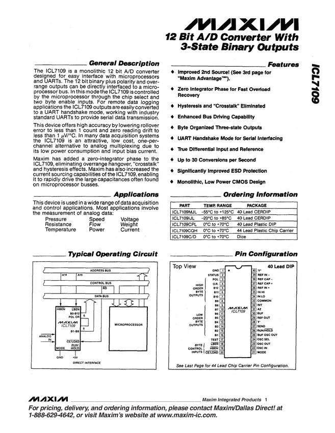 ICL7109 12-Bit A/D Converter with 3-State Binary Outputs