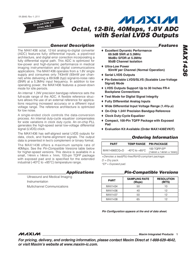 MAX1436 Octal, 12-Bit, 40Msps, 1.8V ADC with Serial LVDS Outputs