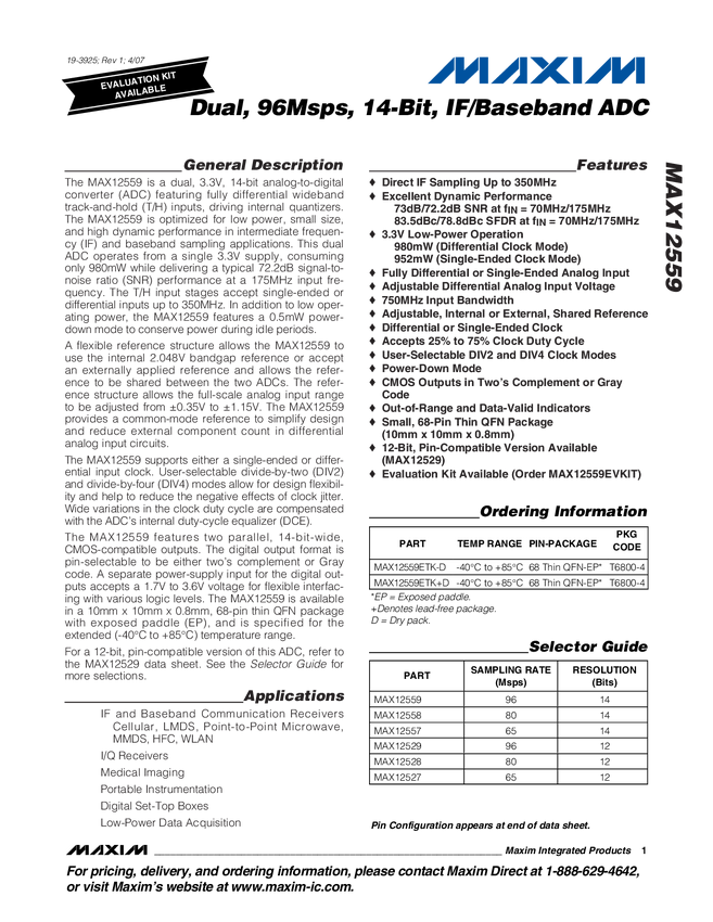 MAX12559 Dual, 96Msps, 14-Bit, IF/Baseband ADC