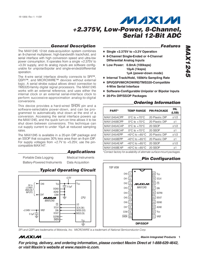 MAX1245 +2.375V, Low-Power, 8-Channel, Serial 12-Bit ADC