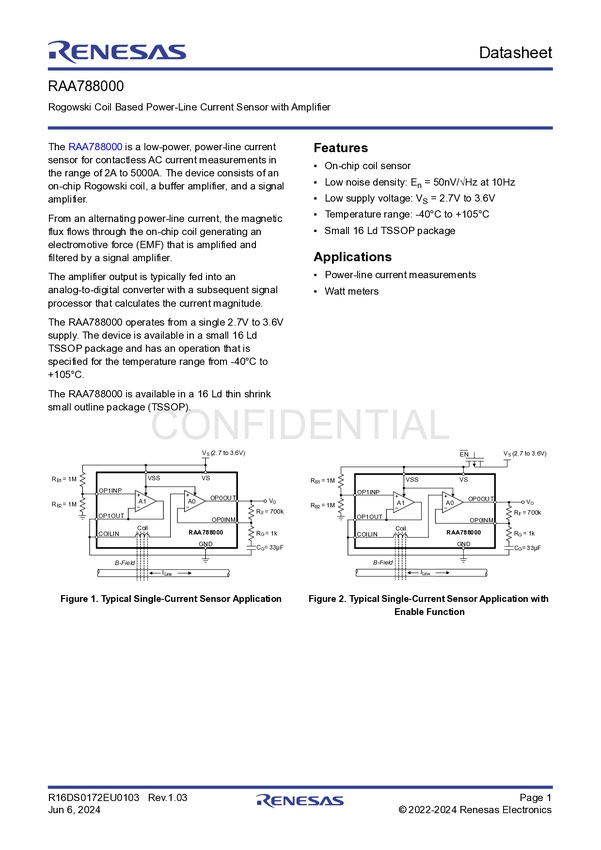 RAA788000 Rogowski Coil Based Power-Line Current Sensor with Amplifier, Contactless A...