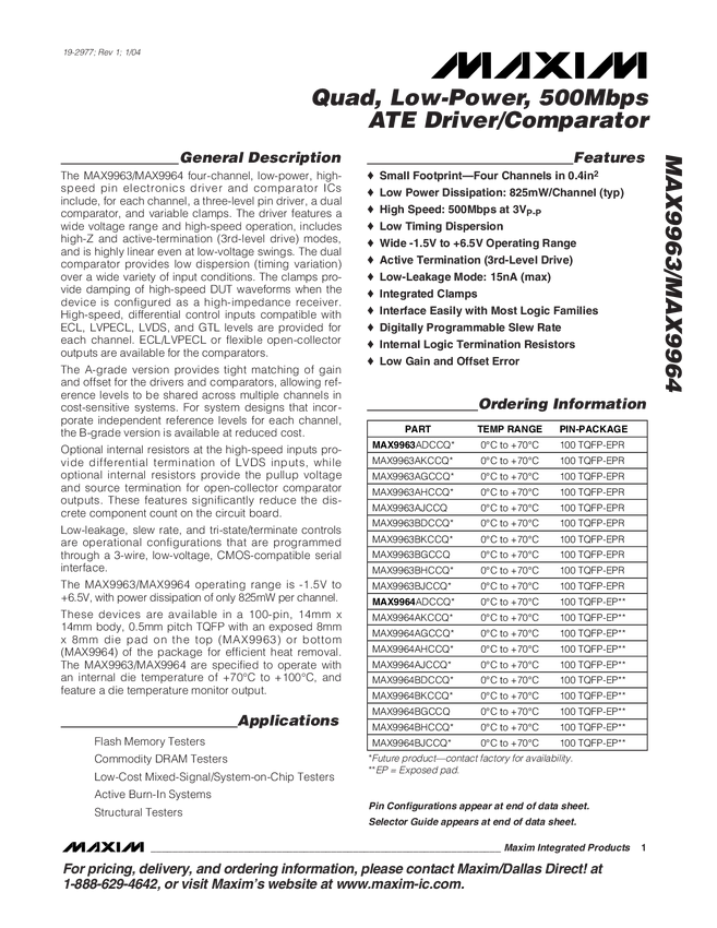 MAX9963 Quad Low-Power 500Mbps ATE Driver/Comparator
