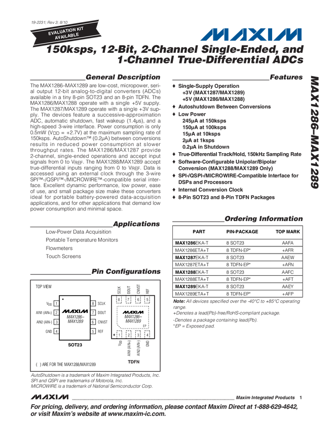 MAX1286 150ksps, 12-Bit, 2-Channel Single-Ended, and 1-Channel True-Differential AD...