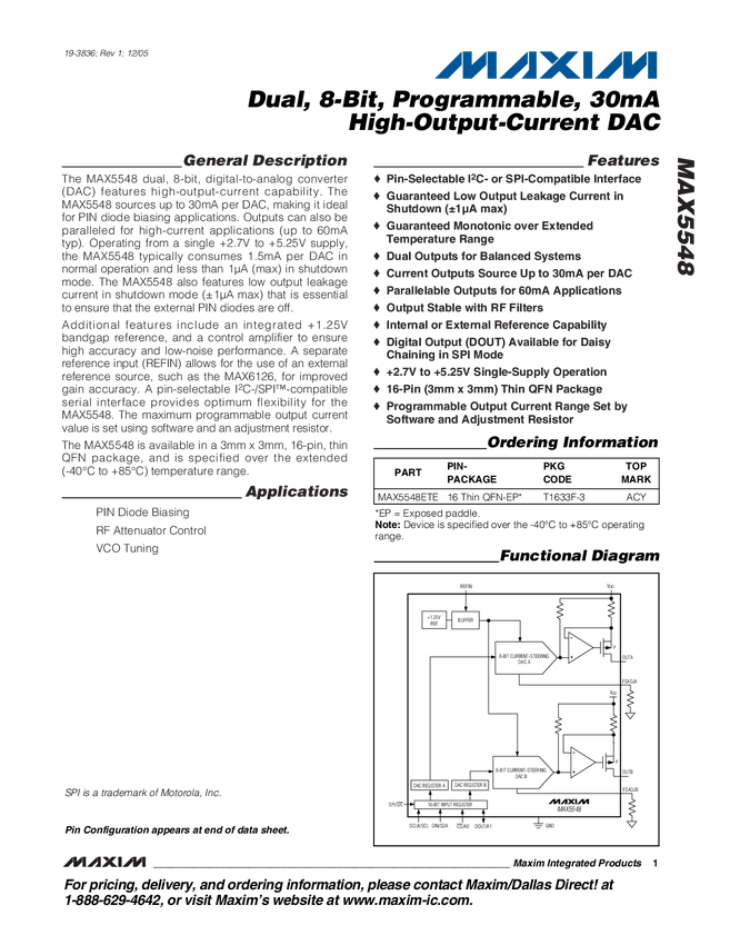 MAX5548 Dual, 8-Bit, Programmable, 30mA High-Output-Current DAC