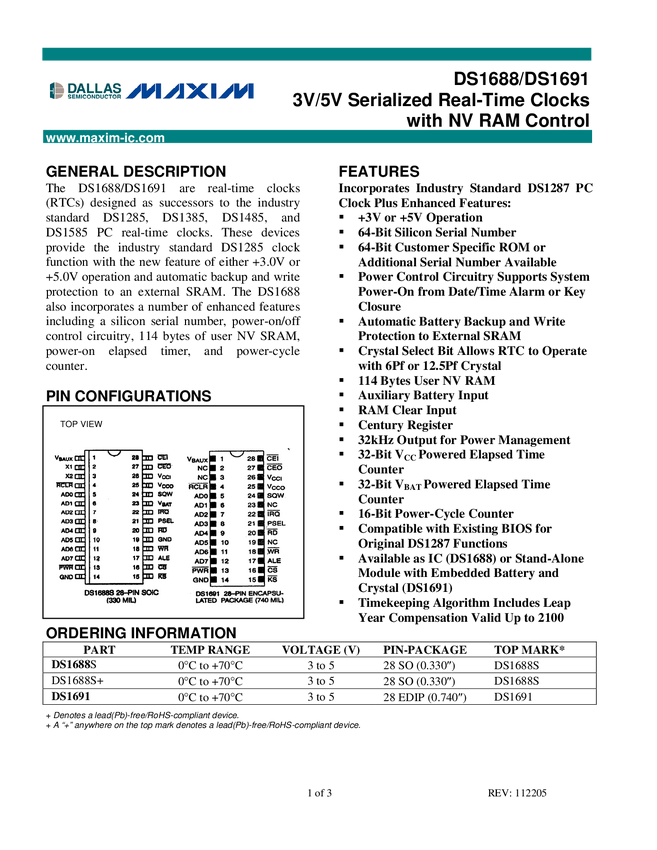 DS1691 3 Volt/5 Volt Serialized Real-Time Clock with NV RAM Control