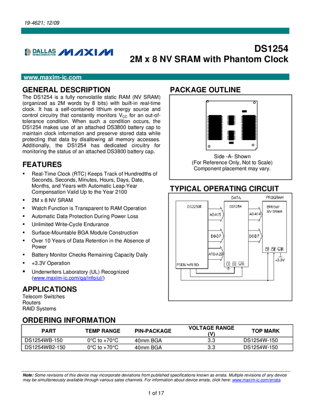 DS1254W 2M x 8 NV SRAM with Phantom Clock