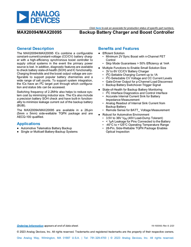 MAX20094 Backup Battery Charger and Boost Controller