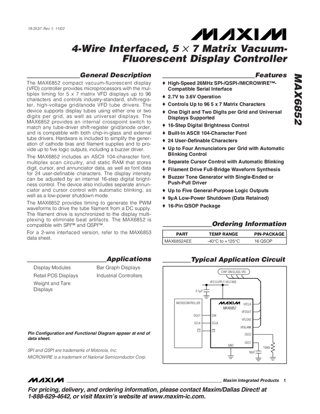MAX6852 4-Wire Interfaced, 5 x 7 Matrix Vacuum-Fluorescent Display Controller