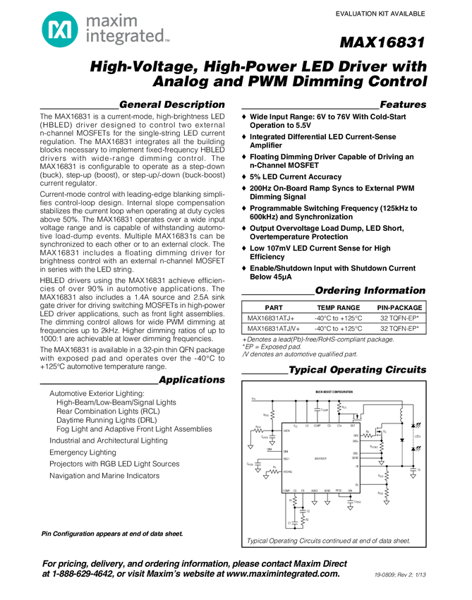 MAX16831 High-Voltage, High-Power LED Driver with Analog and PWM Dimming Control