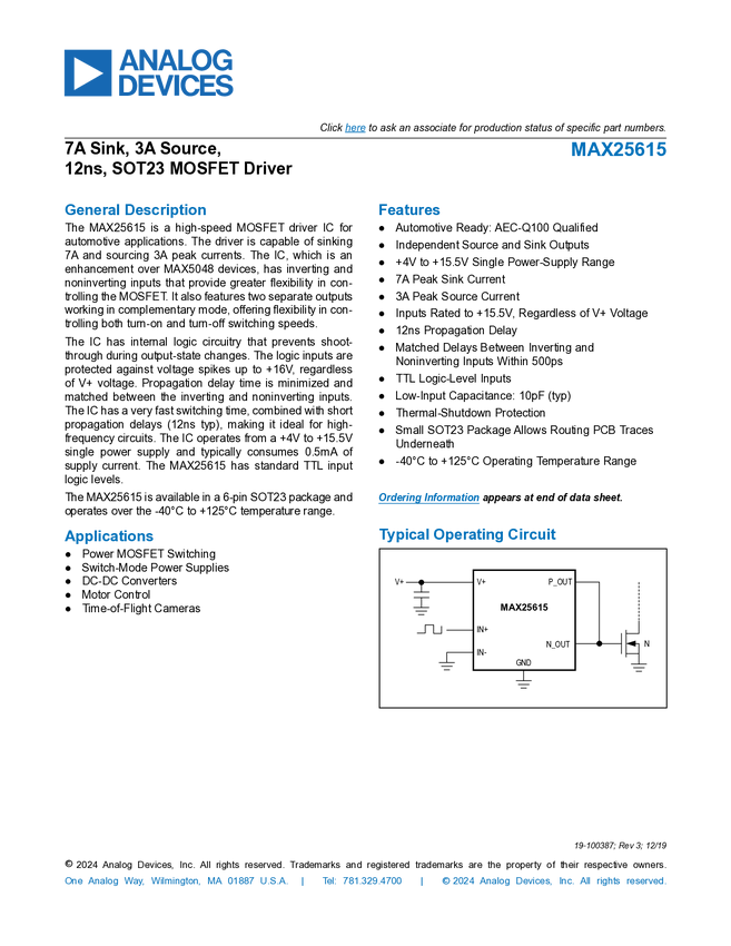 MAX25615 7A Sink, 3A Source, 12ns, SOT23 MOSFET Drivers