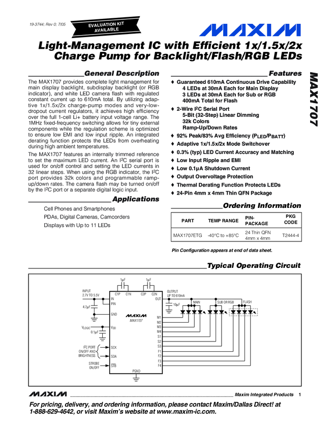 MAX1707 Light-Management IC with Efficient 1x/1.5x/2x Charge Pump for Backlight/Fla...